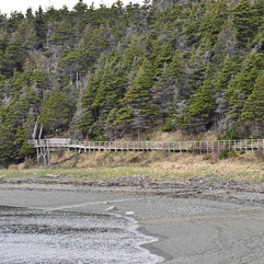 Le chemin passe à travers bois où de nombreux arbres sont couchés, les racines à l’air. La tempête occasionné par l'ouragan fiona de 2022 avait touché le nord de la Nouvelle Ecosse ainsi qu'une partie de Terre Neuve.