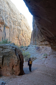 La piste nous amène sur un parking, point de départ d'une randonnée dans 'Capitol Gorge'. On suit un défilé étroit qu'empruntaient les pionniers à la fin du XIX ème siècle. Avant de s'aventurer dans ces coins reculés, ils avaient pour habitude de graver leur passage sur la roche avec leurs noms et la date. Cela a donné le nom de 'pioneer register'. La première date visible date de 1871.