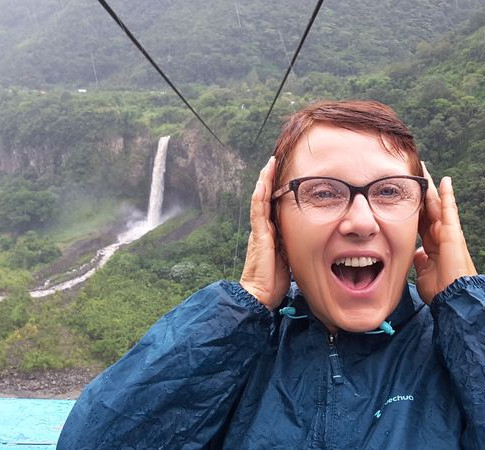 Nous prenons place dans une nacelle, le temps de s'assurer que la grille est bien fermée que nous voici partis et rapidement nous nous trouvons au dessus du vide. Dessous nous, le rio Pastaza de couleur marron coule avec force dans la vallée. La nacelle se rapproche d'une immense cascade puis s'immobilise, le temps de prendre des photos et admirer la paysage tout autour de nous. De droite à gauche et de droite à gauche, la voici qui se balance un peu puis la nacelle reprend son chemin en sens inverse.